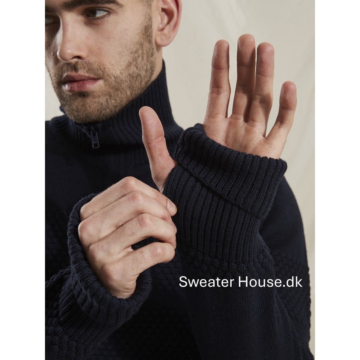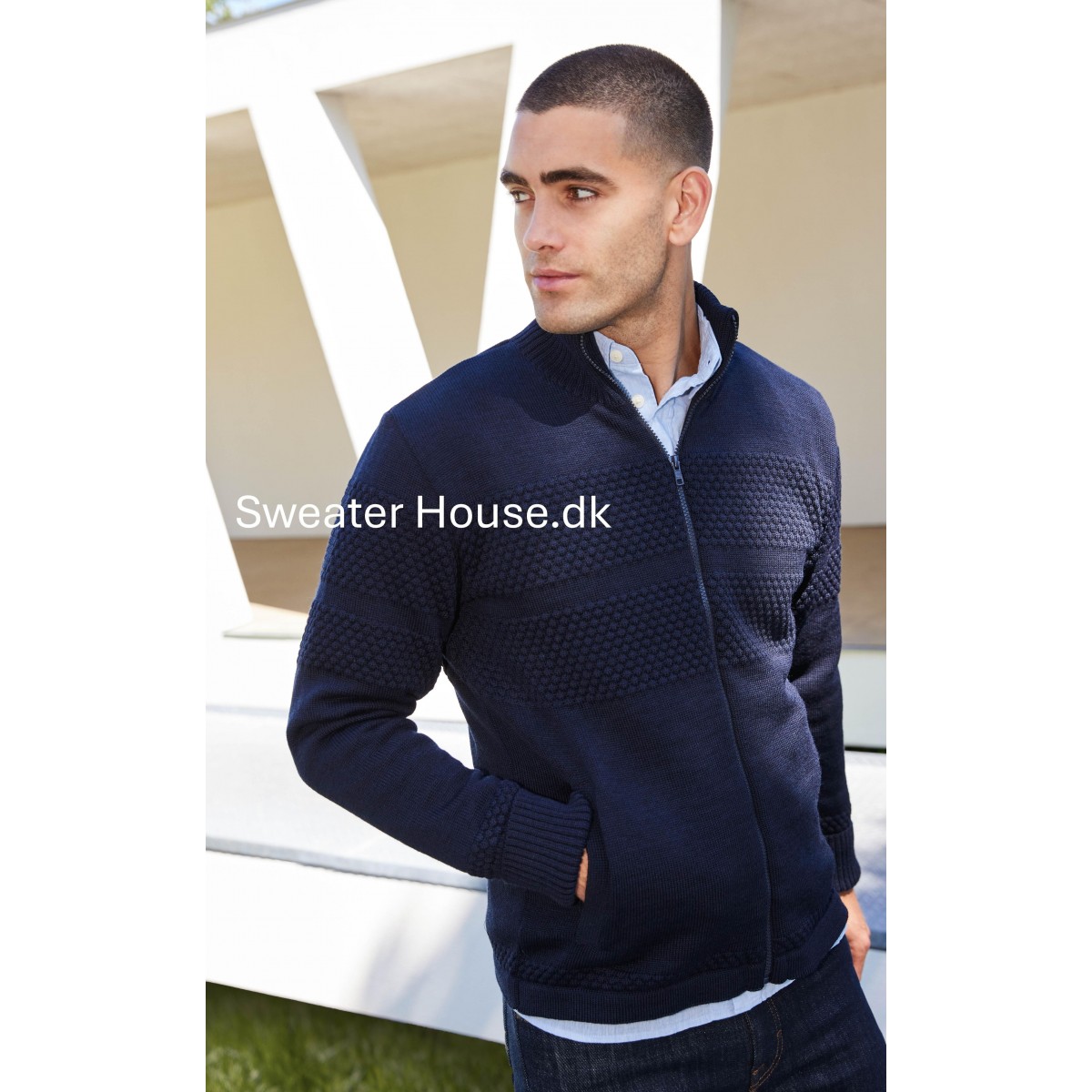 Klassisk og anvendelig sømandscardigan med vindtæt for og gennemgående tone i tone lynlås. Cardiganen er fremstillet i 100% ren uld. Den har ribkanter ved håndleddet samt hul til tommelfingerne, som kan benyttes, hvis man ønsker ekstra varme ved håndled og over håndryggen. Cardiganen går lige ned med en fast kant forneden og har en god længde på ærmerne og har det traditionelle nubret sømandsmønster og er strikket i en god kvalitet.