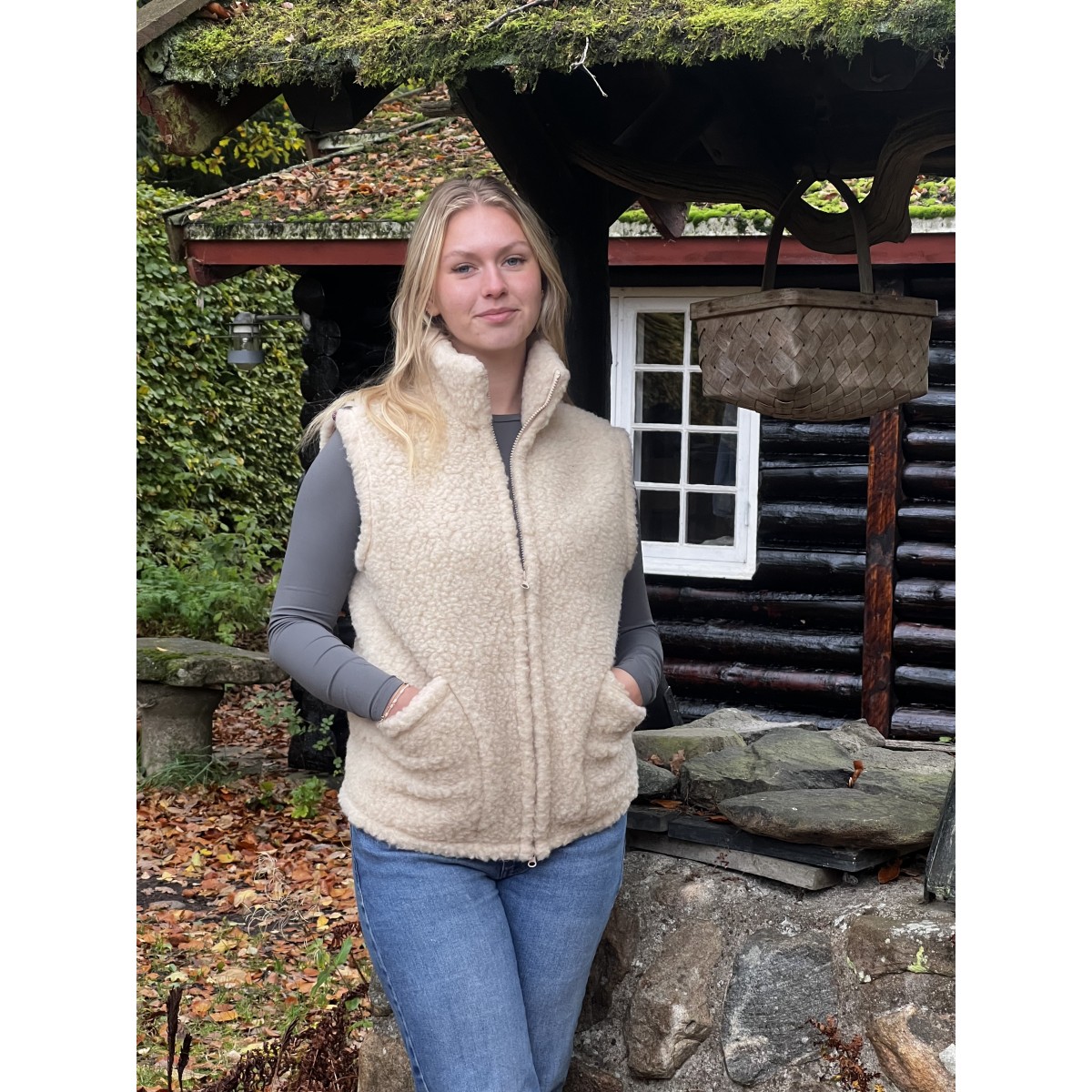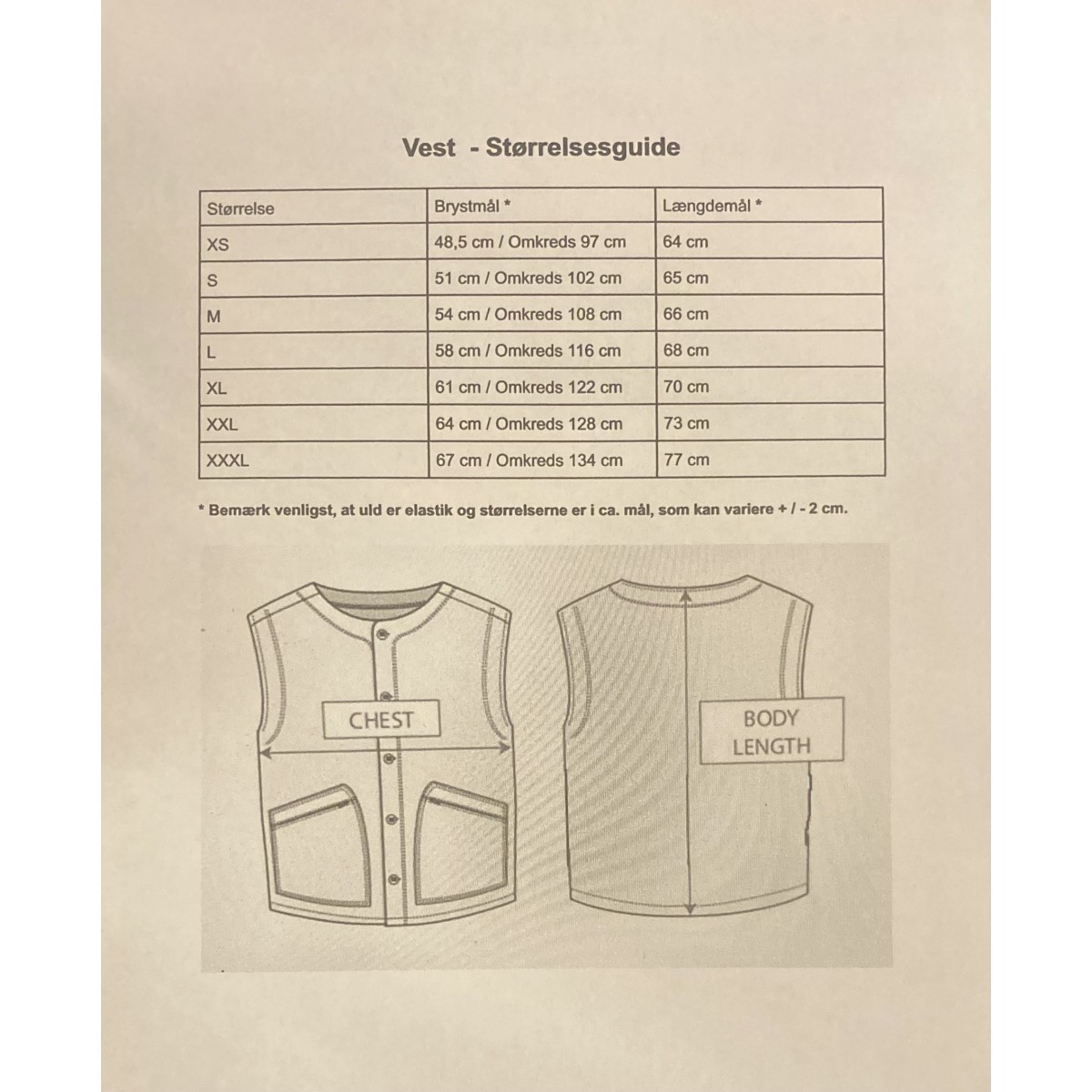 I har taget så godt imod vores nye vest i 100% merino uld, og vi forstår jer godt. Vesten har en lige pasform. Modellen har høj krave, så du kan beskytte halsen mod kulde og holde dig varm. Den er anvendelig med påsyede lommer. Vesten har en 2-vejs gennemgående lynlås, hvilket giver bevægelsesfrihed og øger fleksibiliteten, da du kan justere vestens åbning fra enten toppen eller bunden af vesten. Brug vesten over en sweater, når du har brug for ekstra varme, f.eks. når du er i haven, ude at gå med hunden, under eller over en jakke, eller når der skal slappes af til en god film på sofaen. Mulighederne er uendelige. Vesten er unisex og kan anvendes af både damer og herrer. Vesten findes også i koksgrå. Farve: Råhvid Størrelsesguide: Se venligst foto.